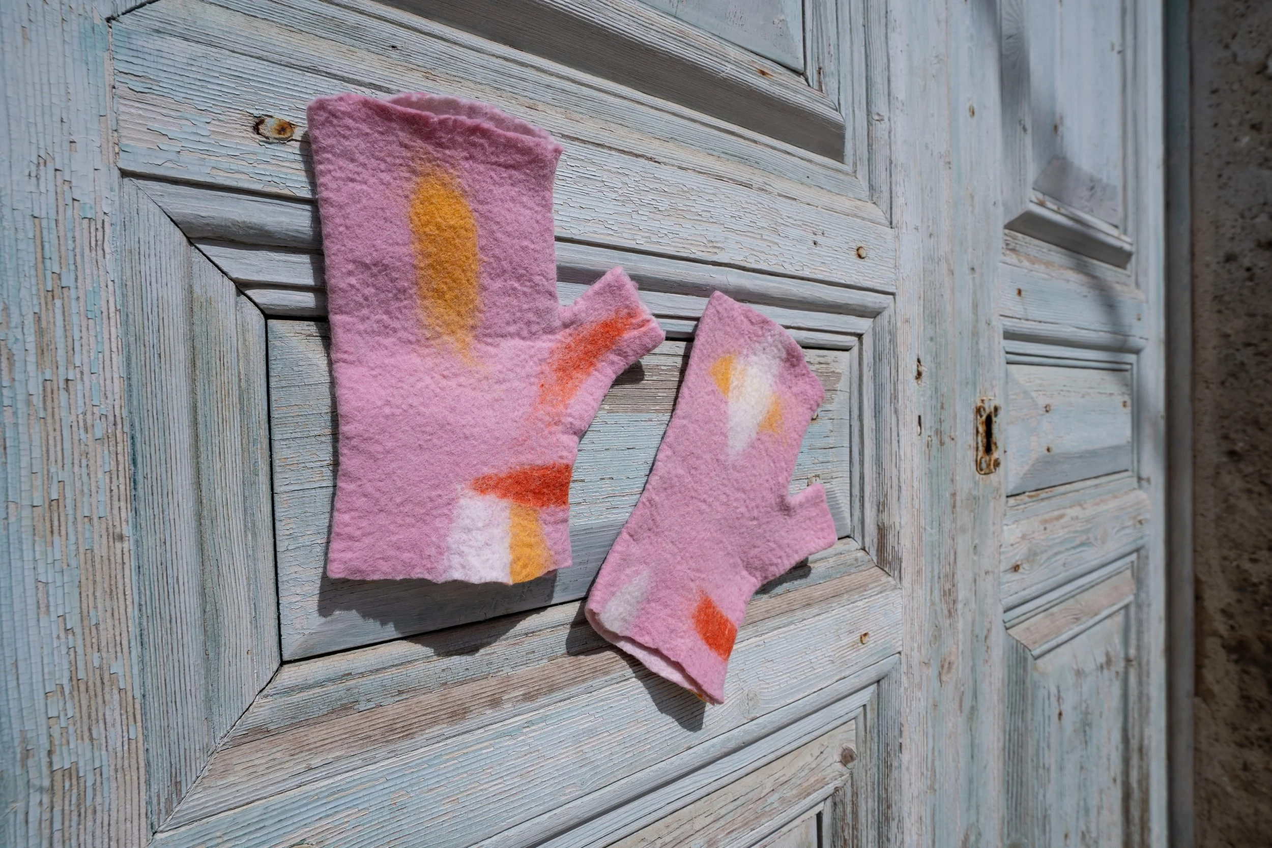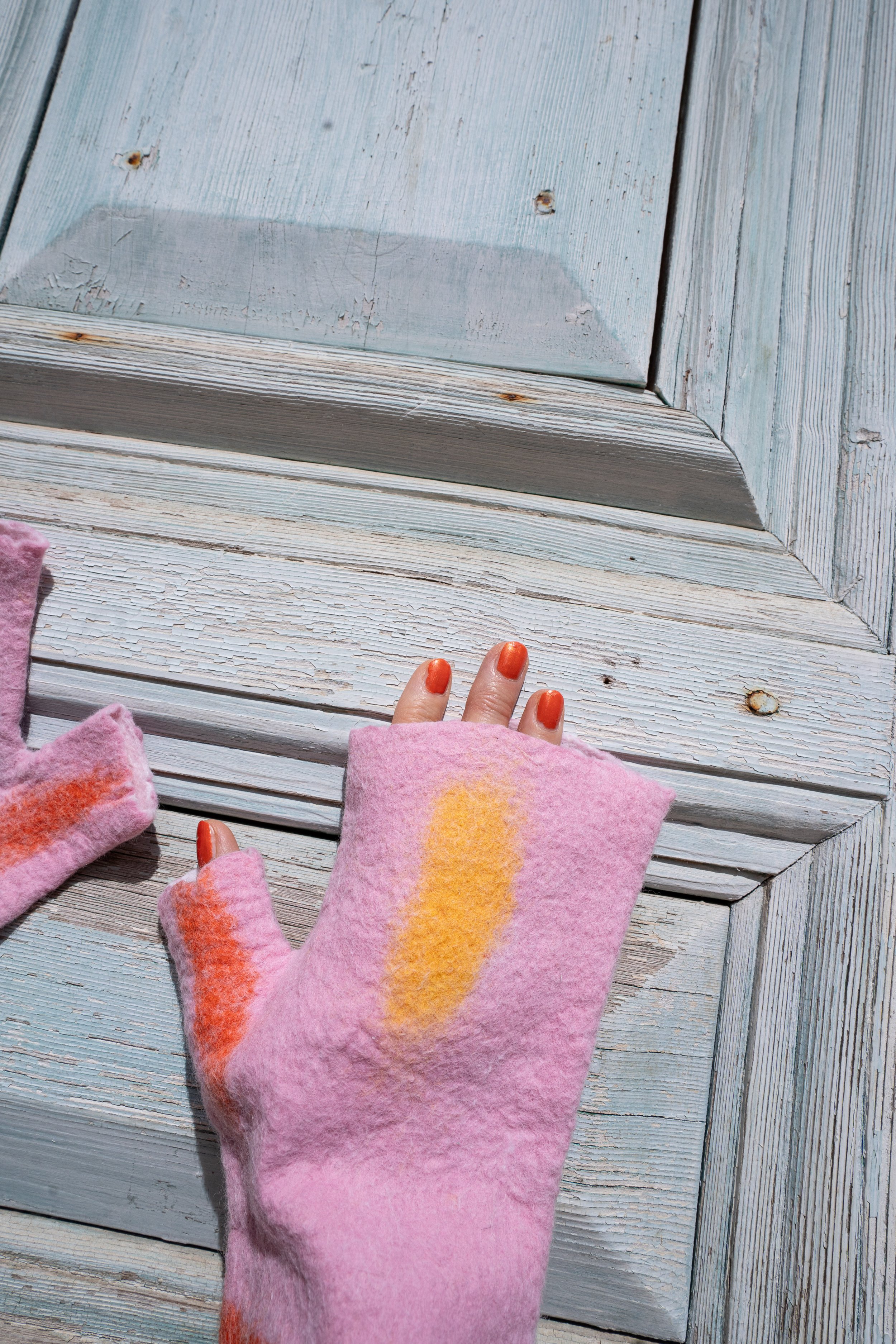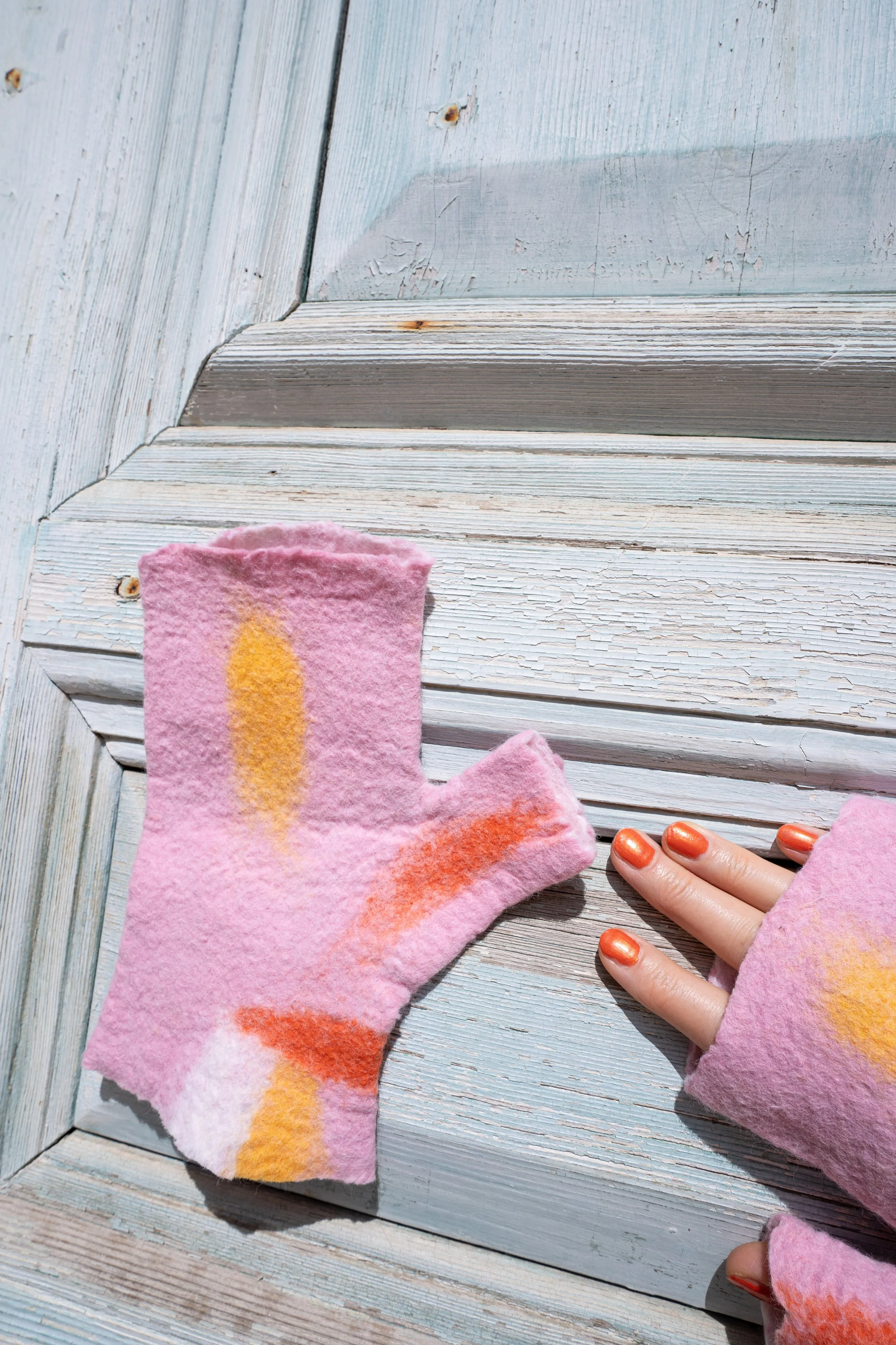 Bright MoodMerino wool gloves. A cheerful pink base with striking details: orange, sunny yellow and white. This is a summery composition for autumn days that will lift your spirits.