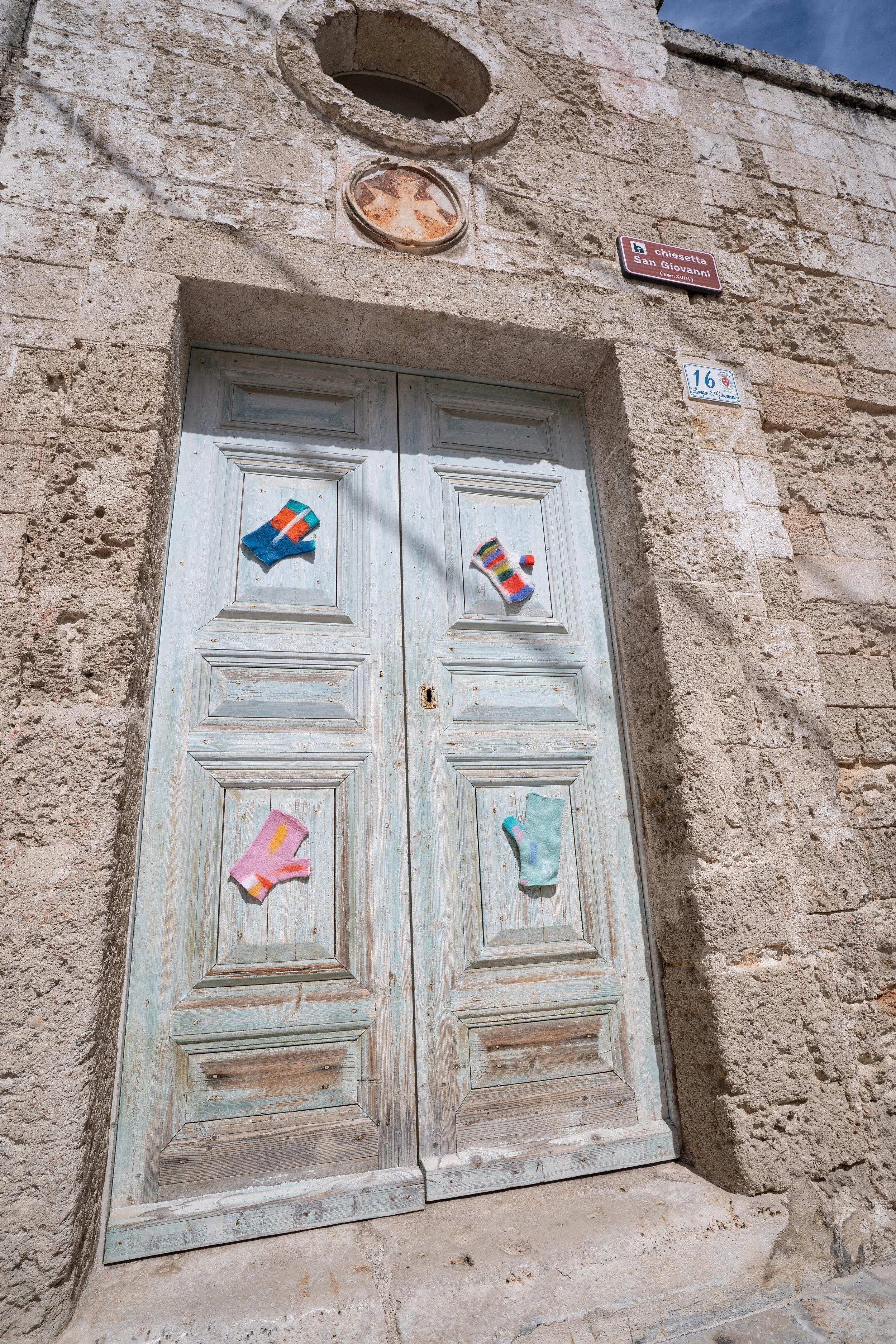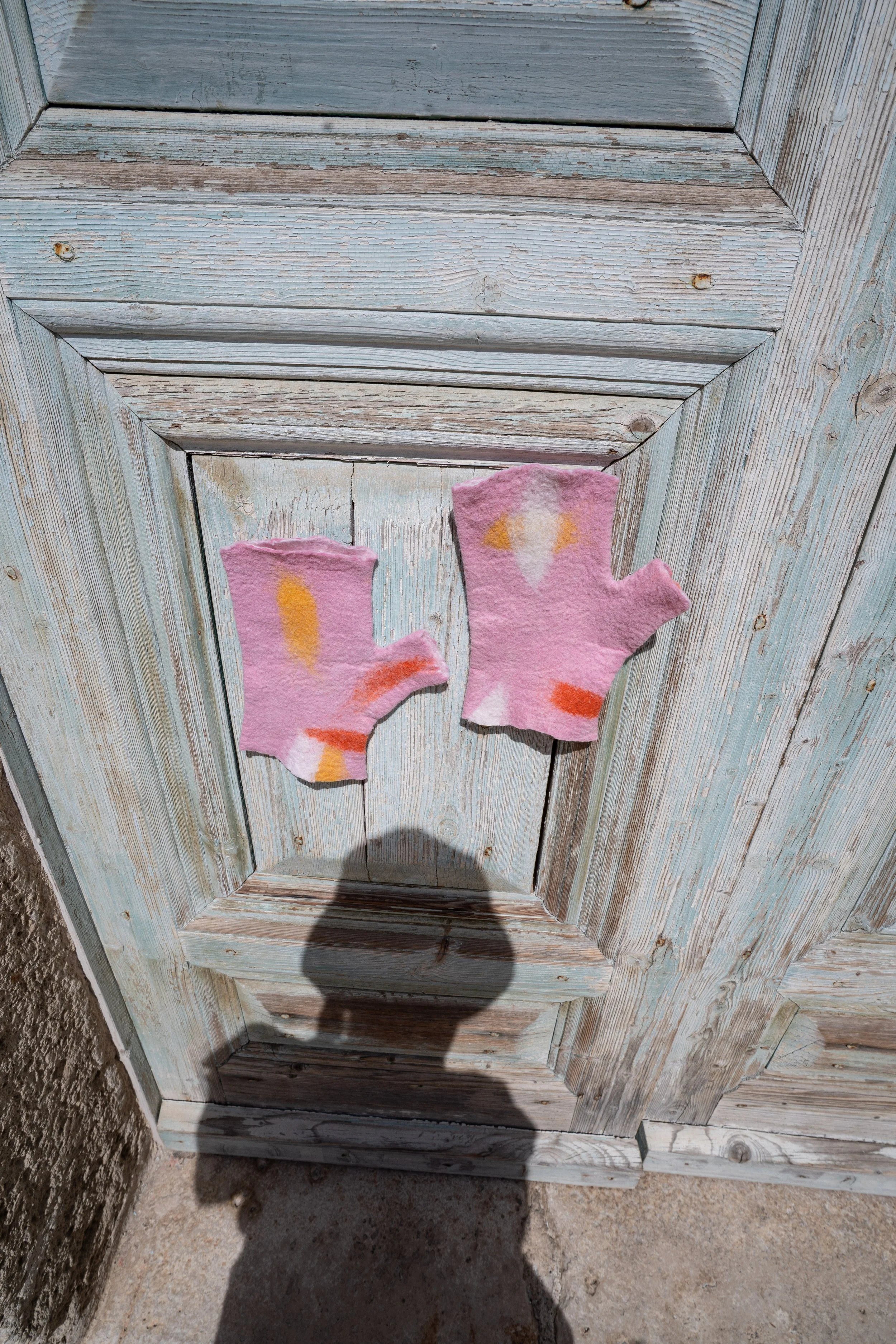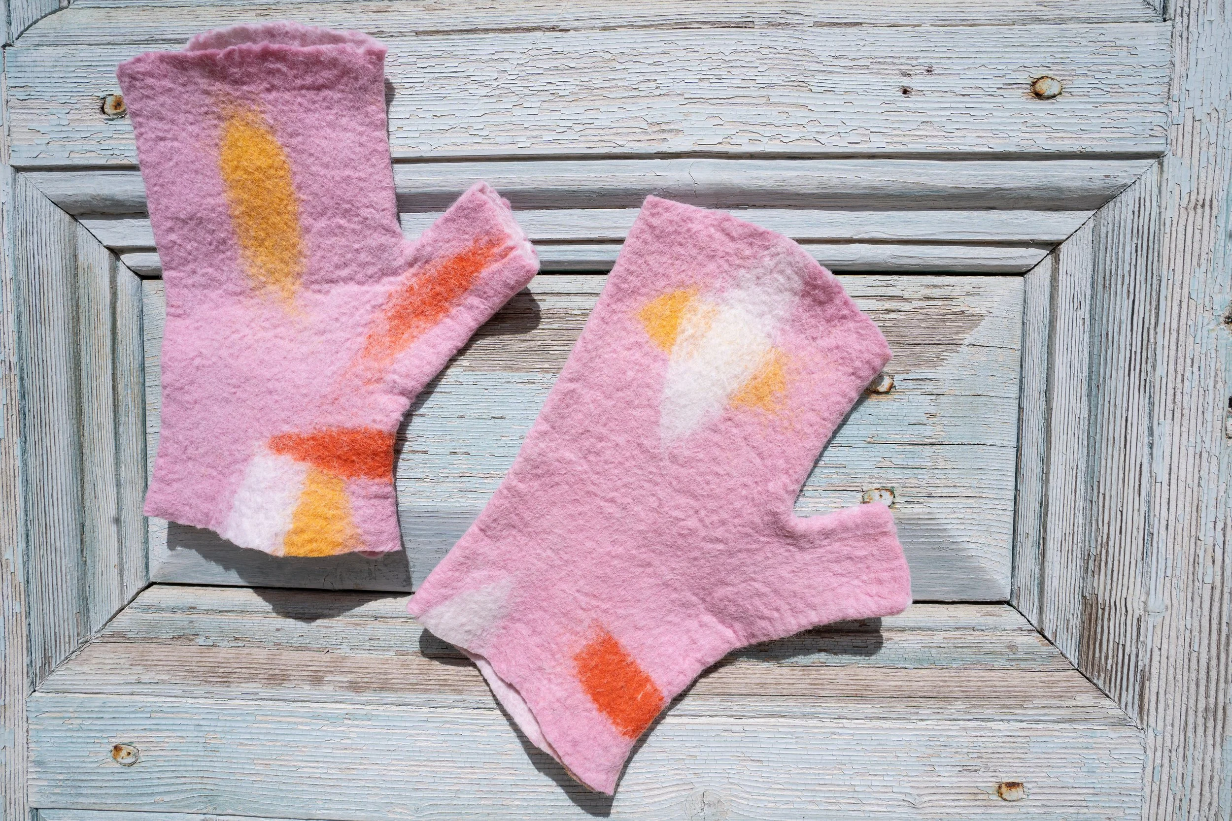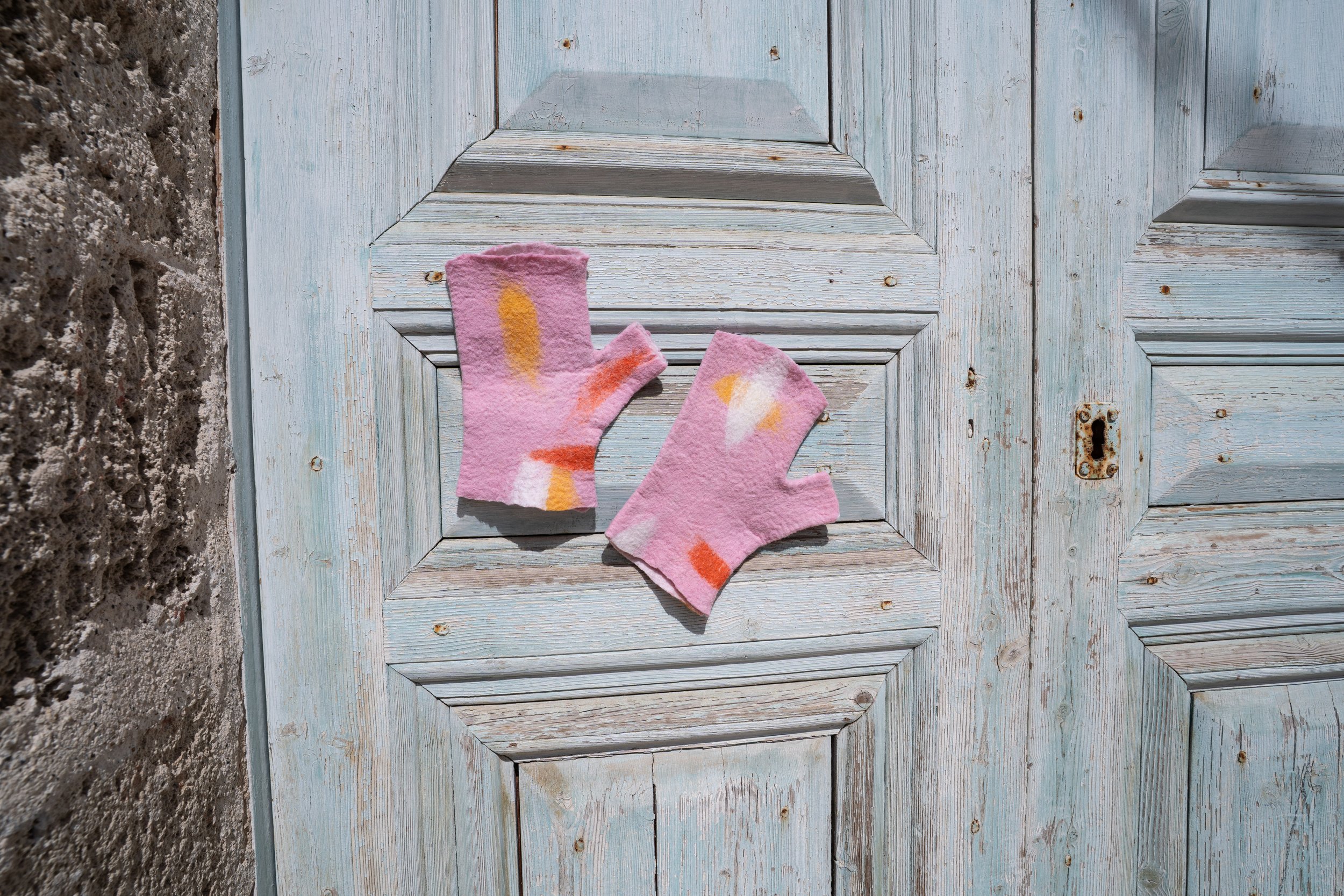Bright MoodMerino wool gloves. A cheerful pink base with striking details: orange, sunny yellow and white. This is a summery composition for autumn days that will lift your spirits.